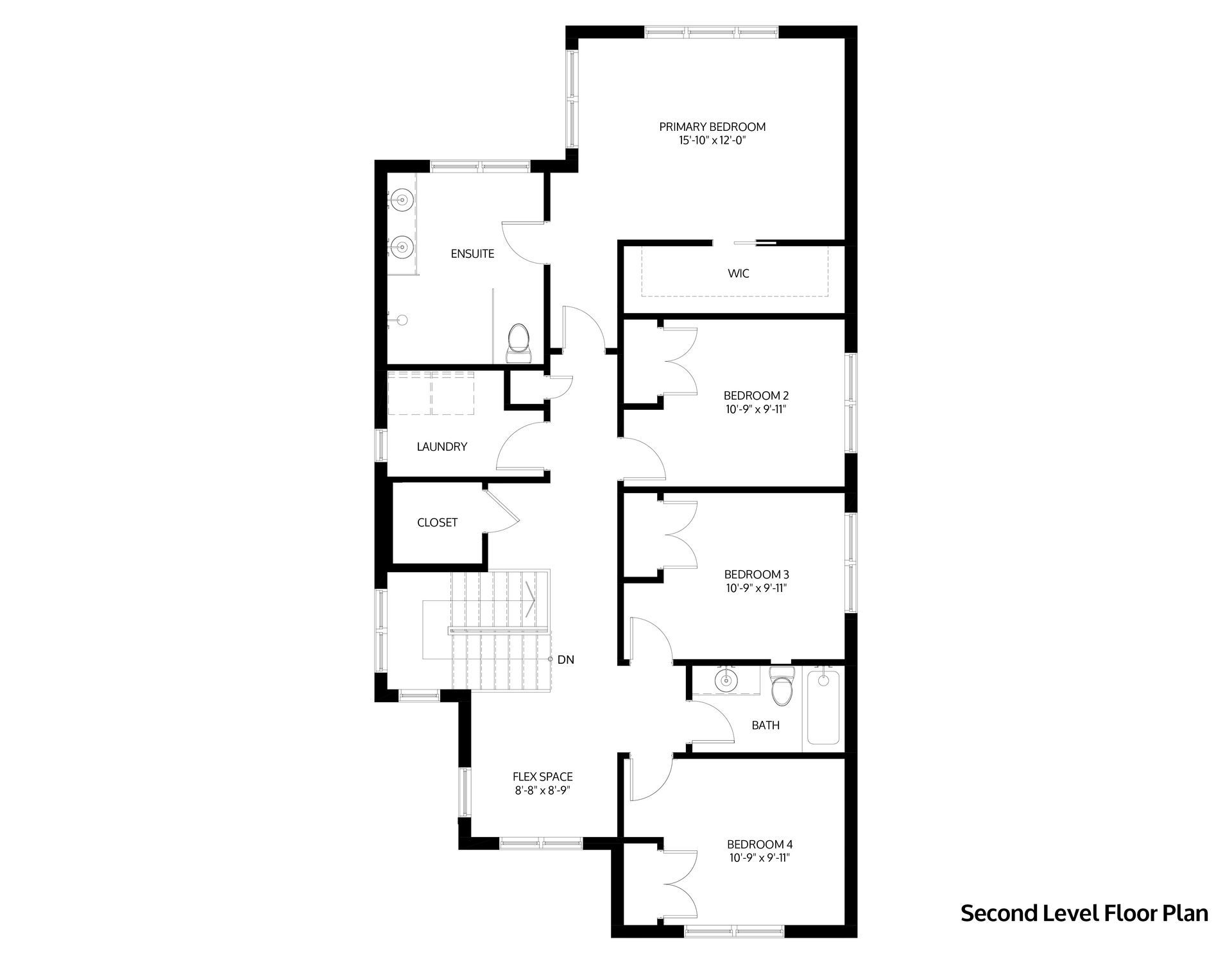 The upper level includes three generously sized bedrooms, a flex space ideal for a home office or playroom, and a well-appointed primary suite featuring a large walk-in closet and a luxurious ensuite bathroom. A full bathroom and a conveniently located laundry room complete this family-friendly floor plan.