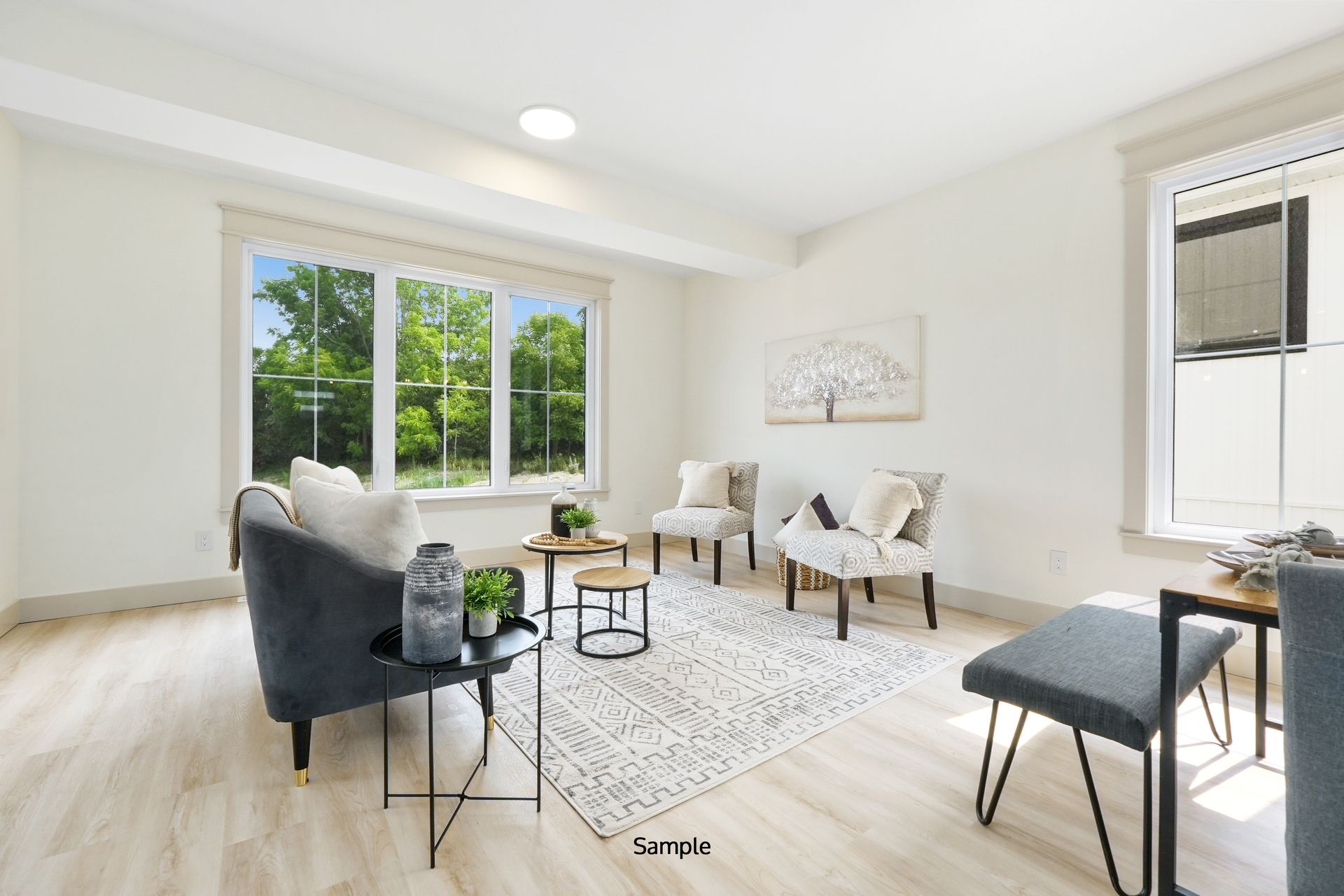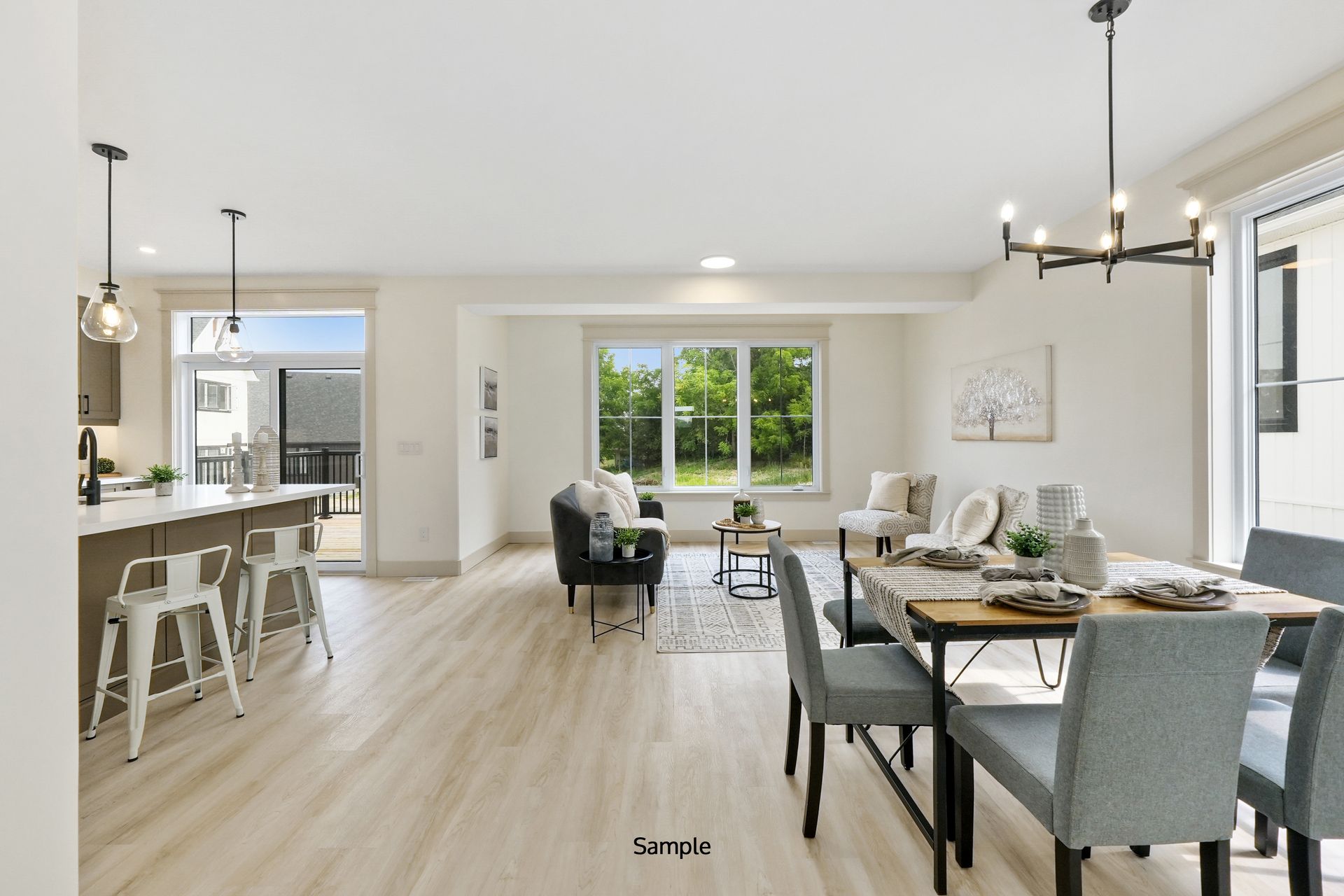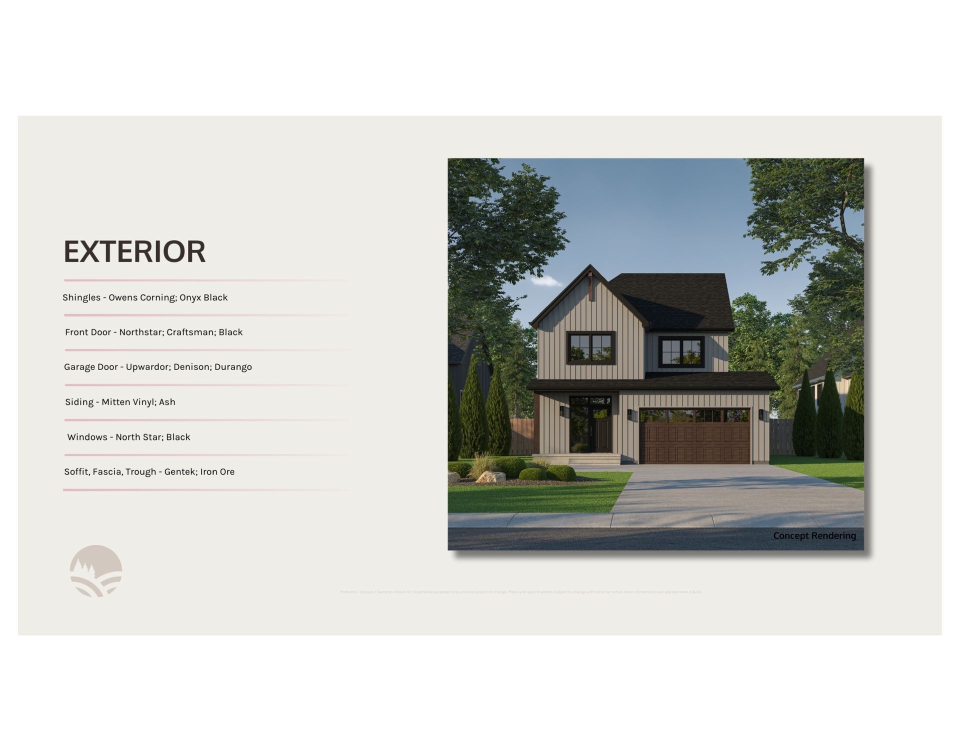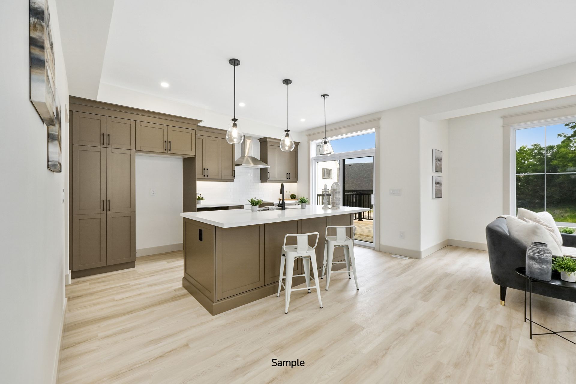 A welcoming covered front porch leads into a spacious foyer with a convenient main-floor powder room. Continue down the hallway into the open-concept kitchen, dining, and great room, designed for both everyday living and entertaining. Quartz countertops, a central island, and seamless flow throughout the space create a functional and welcoming atmosphere. The great room is positioned to face the backyard and provides direct access to the rear deck, offering added privacy and an inviting outdoor setting. Interior access from the attached two-car garage through the mudroom enhances everyday convenience.