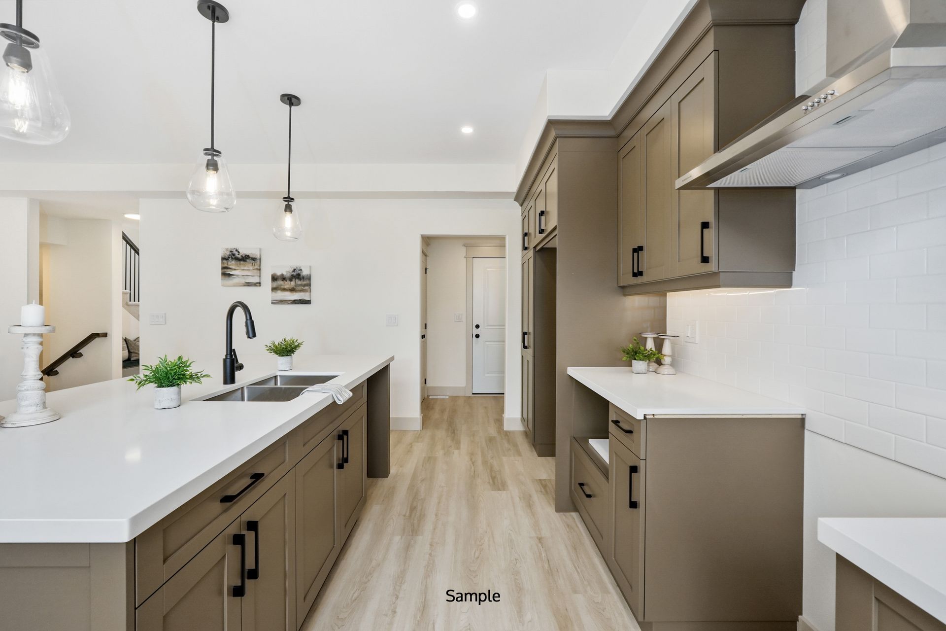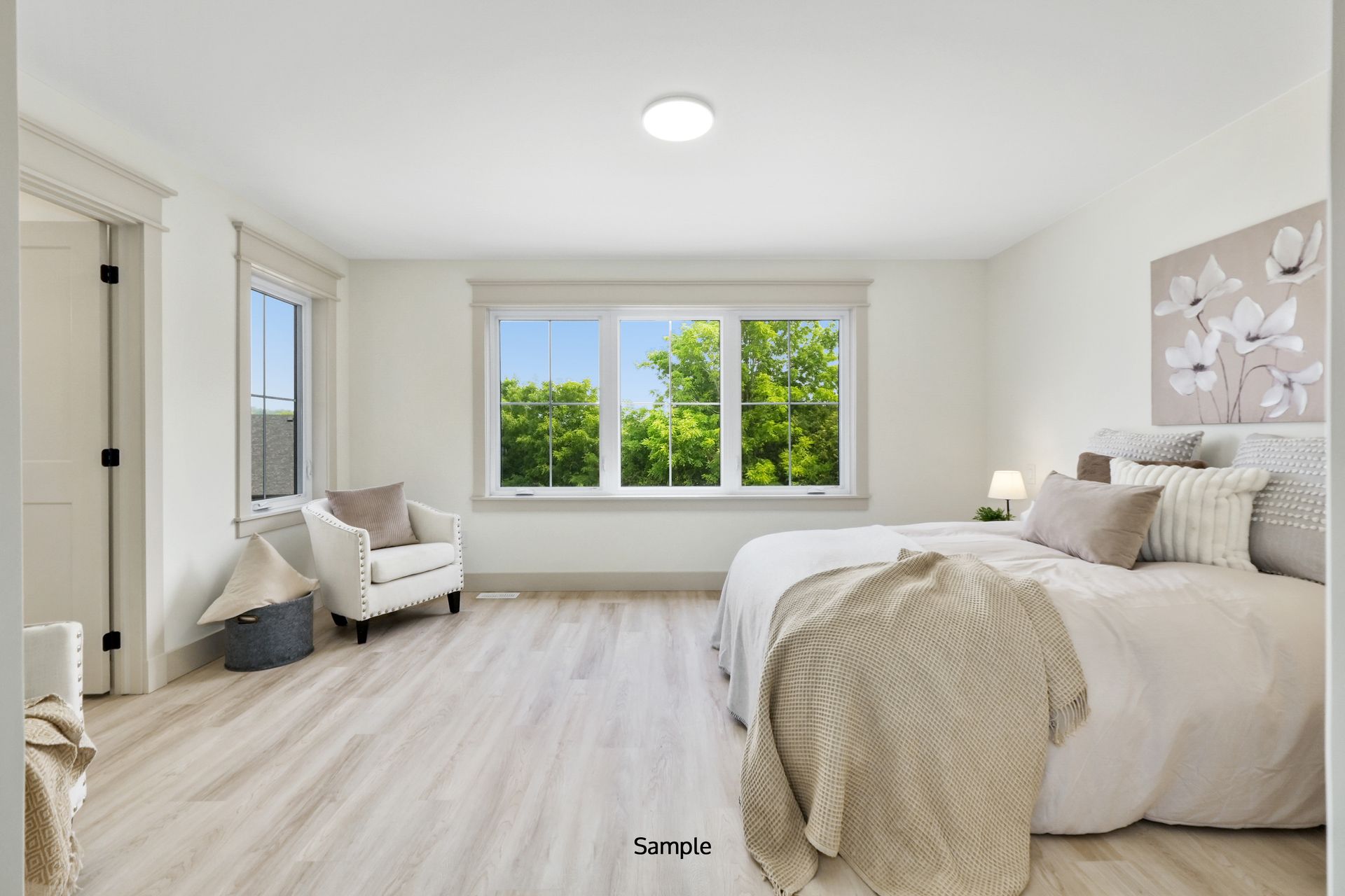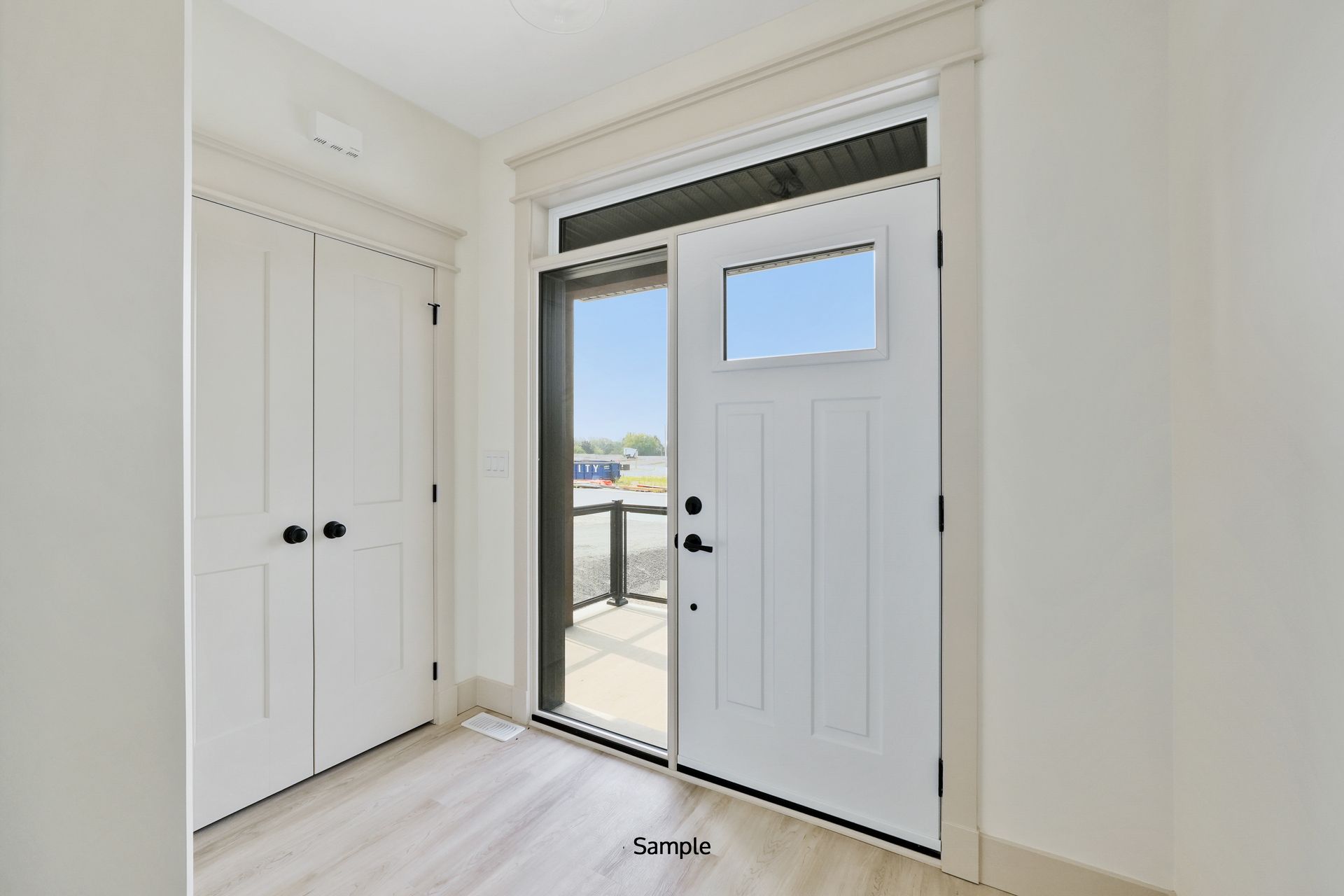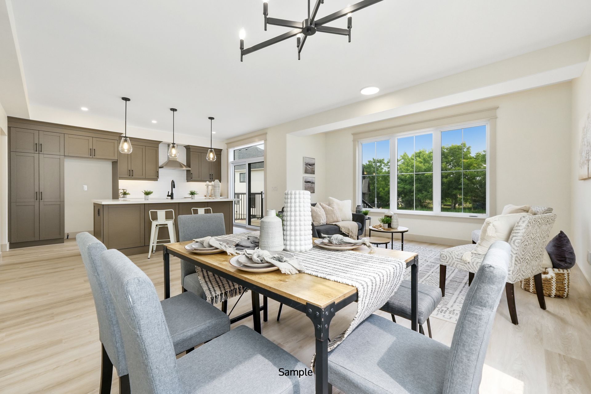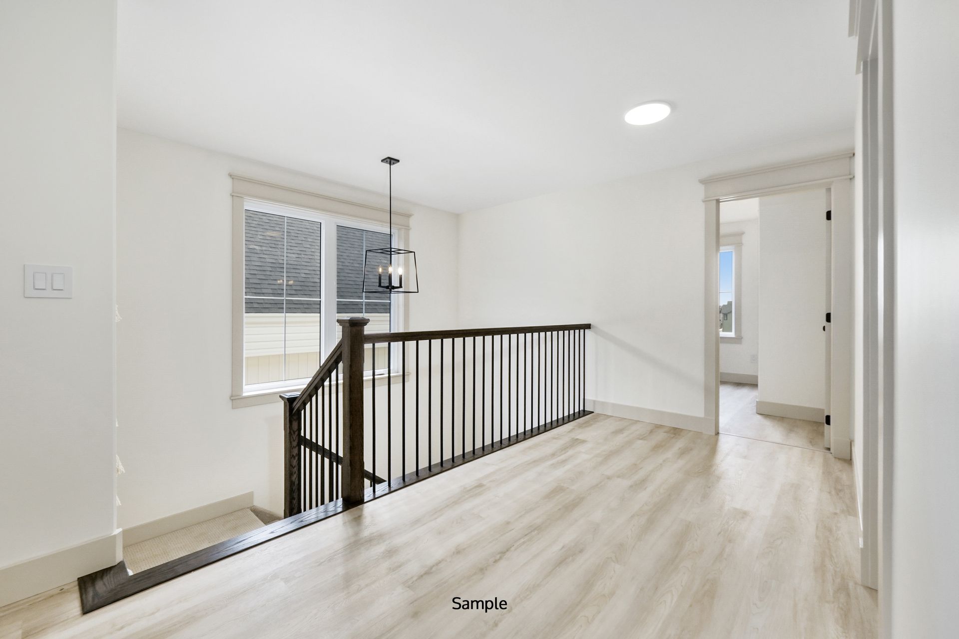 A welcoming covered front porch leads into a spacious foyer with a convenient main-floor powder room. Continue down the hallway into the open-concept kitchen, dining, and great room, designed for both everyday living and entertaining. Quartz countertops, a central island, and seamless flow throughout the space create a functional and welcoming atmosphere. The great room is positioned to face the backyard and provides direct access to the rear deck, offering added privacy and an inviting outdoor setting. Interior access from the attached two-car garage through the mudroom enhances everyday convenience.