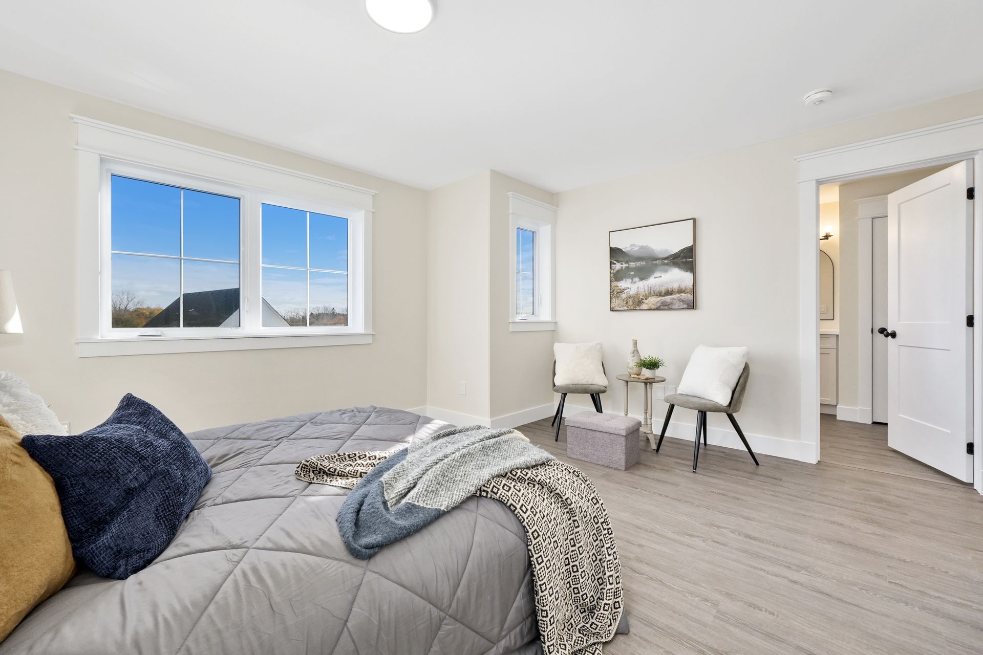 On the upper level, the primary bedroom features a large walk-in closet and a luxurious ensuite bathroom. Additionally, there is a large laundry room, providing added convenience and storage. The two generously sized bedrooms share a primary bathroom, and a rough-in elevator or optional closet is available on this level as well.