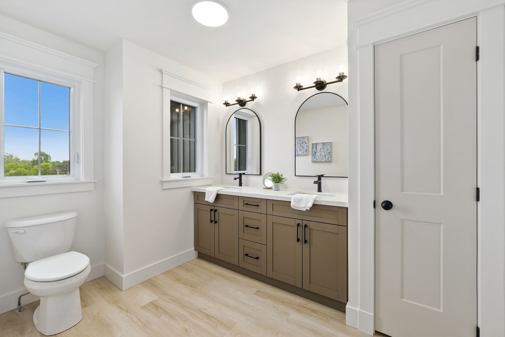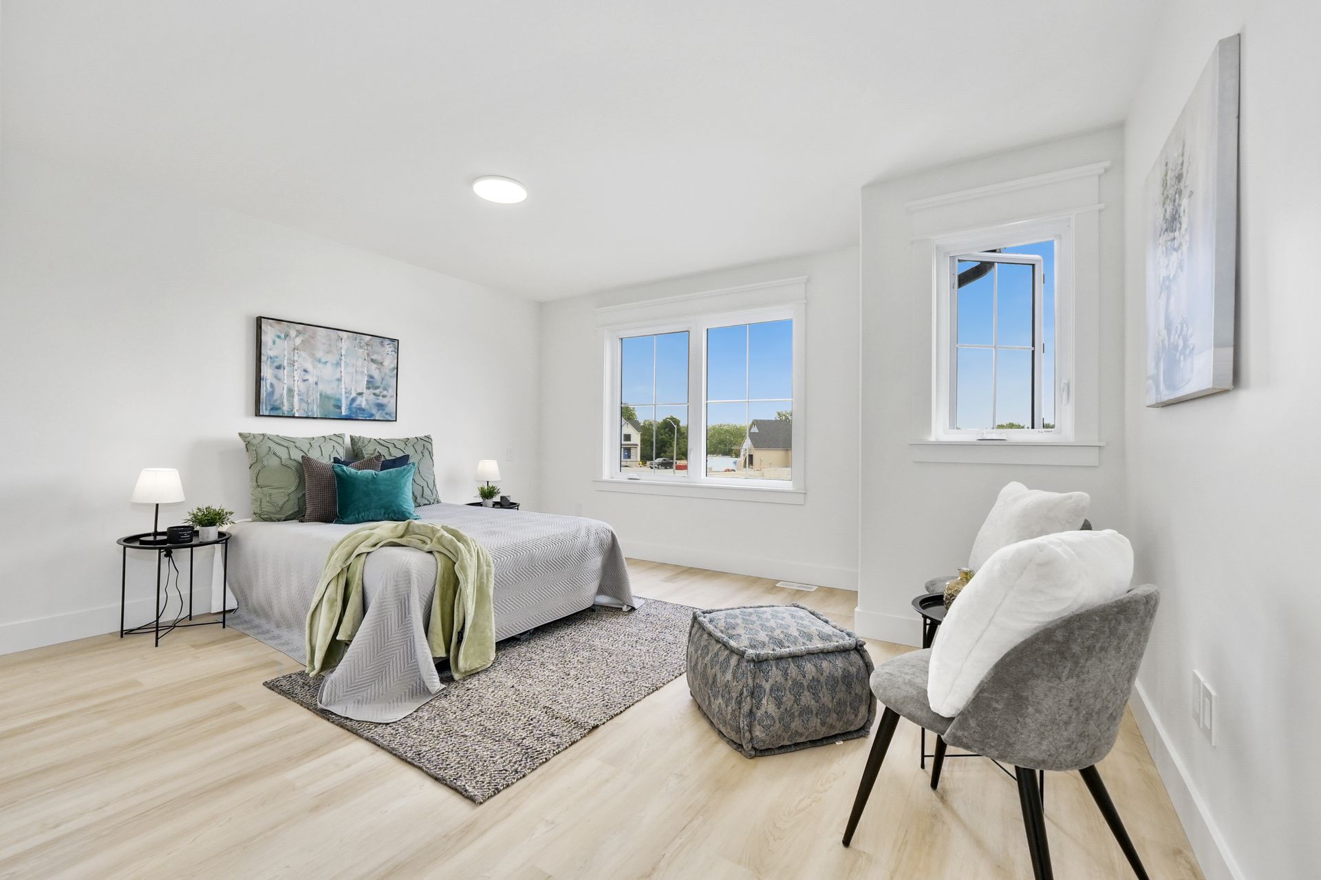 On the upper level, the primary bedroom features a large walk-in closet and a luxurious ensuite bathroom. Additionally, there is a large laundry room, providing added convenience and storage. The two generously sized bedrooms share a primary bathroom.