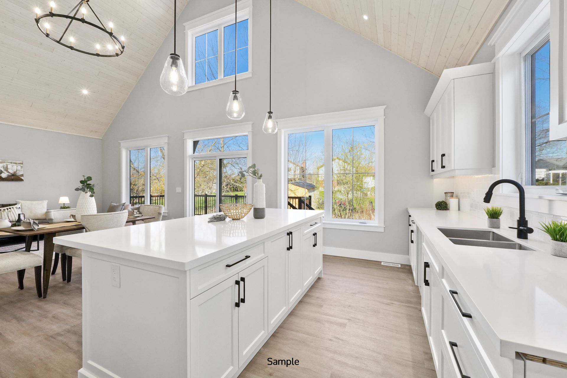 Adjacent to the bedroom is the rough-in for an elevator, which can be outfitted as a closet or main floor laundry if the elevator is not opted in. The back of the home opens up into a stunning open-concept kitchen, dining room, and great room, highlighted by a soaring vaulted ceiling, perfect for gatherings and creating a spacious, airy atmosphere.